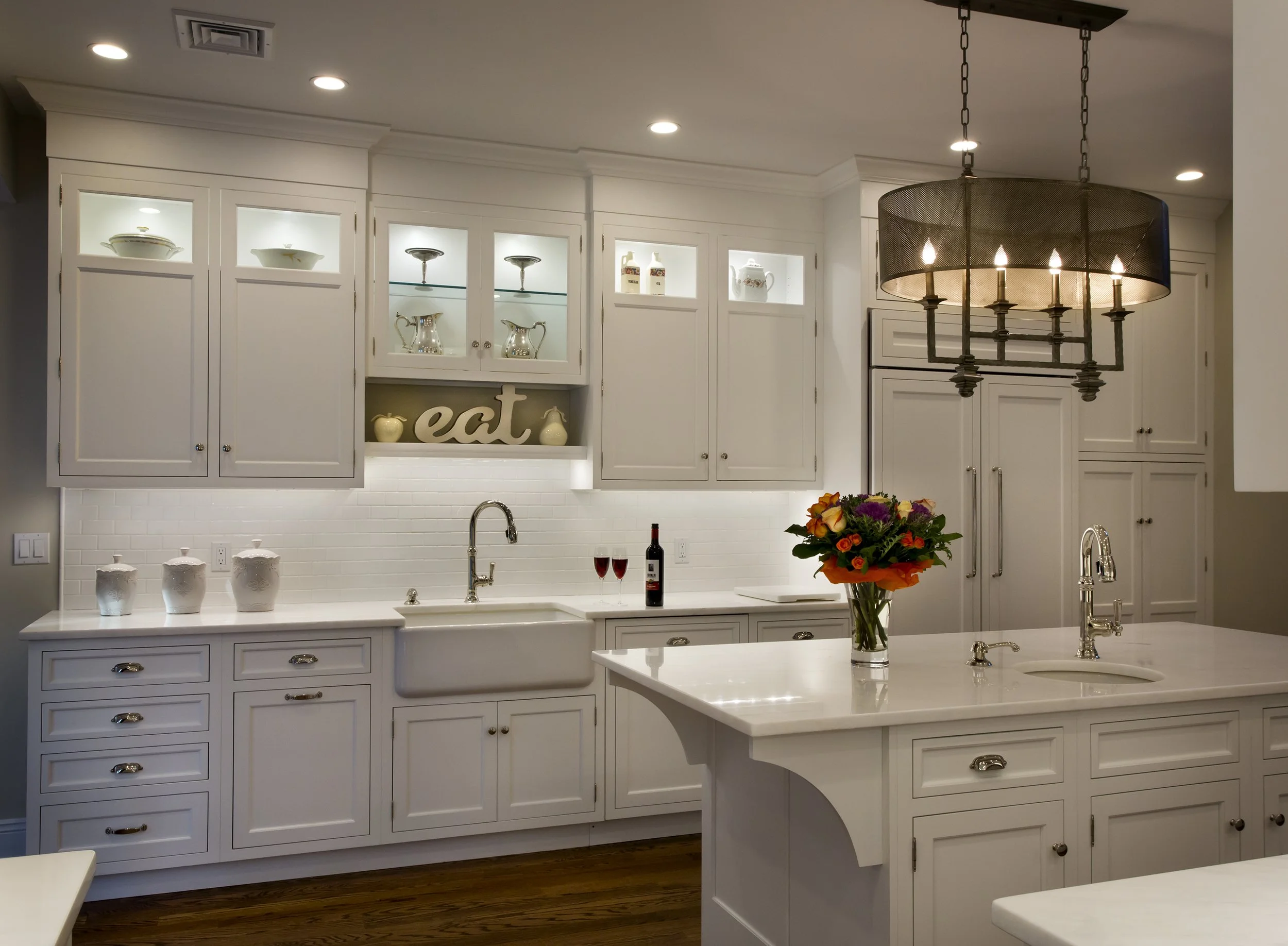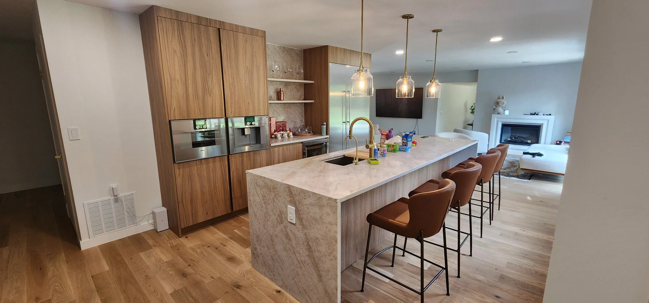 White and wood (or color) tone kitchens - While all white kitchens have decreased in popularity, white and wood tone (or blue, green) kitchens are a huge design favorite of Long Islanders and New York City dwellers. Stylish white perimeter cabinets with a deep wood tone or color island has become our top seller - modern, transitional or traditional. This combination allows the brightness white offers coupled with a rich toned island adding great character to the space. Some people like to add another touch of color in the tall cabinets, matching the island color. Slab doors are gaining popularity on Long Island and remain popular in NYC.